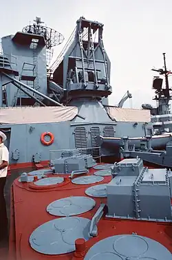 Installiert und auf See erprobt wurde das System auf Kreuzern der Kara- und Slawa-Klasse. Die 5W55RM-Rakete wird in sechs oder acht Raketen fassenden, rotierenden Raketenwerfern unter Deck aufbewahrt.