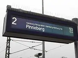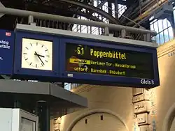 Während bis etwa 2002 Fallblattanzeiger[17] des italienischen Herstellers Solari & C. Udine genutzt wurden, verwendet die S-Bahn im gesamten Netz heute dynamische Fahrtzielanzeiger, die zentral vom Betriebsführungssystem (IMS) der S-Bahn angesteuert werden: zum einen einen älteren Typ mit dreizeiliger Matrixanzeige, der zwischen 2001 und 2011 installiert wurde, und zum anderen einen neueren Typ mit hochauflösenden Flüssigkristallmonitoren, der seit August 2020 installiert wird und den älteren Typ ersetzen soll.[18] Auf den Stationen der Wechselstromstrecke nach Stade wurden bis 2023 die dynamischen Standardanzeiger von DB Station&Service durch die S-Bahn genutzt, bis diese durch das neuere Modell der S-Bahn ersetzt wurden.
