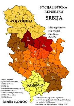 Innerhalb der Sozialistischen Republik Serbien existierten seit 1974 zwei autonome Provinzen, Vojvodina und Kosovo und Metochien. Die dazwischen liegende Region Zentralserbien (auch Engeres Serbien genannt) hatte keine eigene administrative Verwaltung und unterstand direkt der Regierung der SR Serbien. Bis auf die umstrittene Unabhängigkeitserklärung von Kosovo 2008 entspricht dies auch der politischen Gliederung der heutigen Republik Serbien.