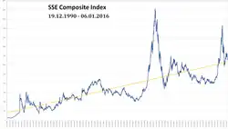 Am 13. Juni 2001 schloss der chinesische Leitindex bei 2.242,42 Punkten. Der Gewinn seit Juli 1994 beträgt 571,5 Prozent. Nach dem Platzen der Spekulationsblase im Technologiesektor (Dotcom-Blase) fiel der Index bis 11. Juli 2005 auf einen Tiefststand von 1.011,50 Punkten. Das war ein Rückgang seit Juni 2001 um 54,9 Prozent. Der 11. Juli 2005 bedeutete das Ende der Talfahrt. Ab Sommer 2005 war der SSE Composite wieder auf dem Weg nach oben. Am 26. Februar 2007 schloss er zum ersten Mal über 3.000 Punkte. Am folgenden Tag fiel er um 8,84 Prozent auf 2.771,79 Punkte. Am 23. August 2007 überschritt der Index zum ersten Mal die Marke von 5.000 Punkten. Am 16. Oktober 2007 erreichte der Shanghai Composite mit einem Schlussstand von 6.092,06 Punkten ein Allzeithoch.