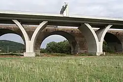 Die denkmalgeschützte Gewölbereihenbrücke, mit Kalksteinmauerwerk verkleidet, gehört mit 794 m[1] zu den längsten ihrer Art in Deutschland. Im Zweiten Weltkrieg, am 11. April 1945, kurz vor Einmarsch der Amerikaner am nächsten Tag, wurde sie teilweise gesprengt. Von 1952 bis zum 15. April 1954 erfolgte der detailgetreue Wiederaufbau. Das Bauwerk besteht aus der 117 m langen Vorlandbrücke West mit einem Bogen zur Unterführung der Bundesstraße, der 648 m langen Hauptbrücke sowie der 29 m langen Vorlandbrücke Ost. Die 17[1] halbkreisförmigen Gewölbe der Hauptbrücke weisen lichte Weiten von 26 bis 32,5 m auf und sind größtenteils mit Klinkersteinen gemauert. Die Pfeilerachsabstände betragen 33,00 m, 2×36,05 m, 2×36,77 m, 2×37,51 m, 2×38,27 m, 2×39,03 m, 2×39,81 m, 2×40,61 m, 41,43 m und 37,50 m, was eine Gesamtlänge von 648,03 m ergibt. Die Fahrbahn liegt auf einer maximalen Höhe von ungefähr 21 m über dem Saaletal.