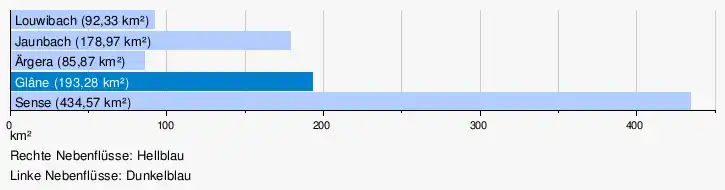 | Jaunbach | CH799 | rechts | 27,2 | 178,97 | 9,15 | frz. La Jogne, mündet in den Lac de la Gruyère |
