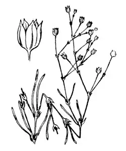Die Blüten sind radiärsymmetrisch und fünfzählig mit doppelter Blütenhülle. Die fünf 1,5 bis 2 Millimeter langen, breit-lanzettlichen, trockenhäutigen Kelchblätter besitzen einen grünen Rückennerv.[1] Die fünf weißen Kronblätter sind kürzer als die Kelchblätter.[1] Es sind drei Griffel vorhanden.[1]