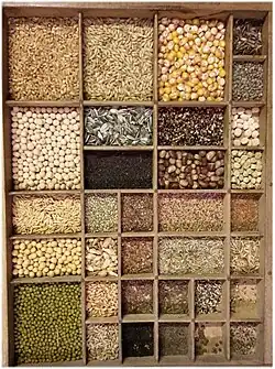 Zur Bewahrung der genetischen Vielfalt bei Pflanzen (Erhaltung der Artenvielfalt) werden seit Mitte des 20. Jahrhunderts Saatgutproben möglichst aller verfügbarer Zuchtsorten und auch alter Landsorten, sowie von Wildformen unserer Kulturpflanzen gesammelt, ausgetauscht und langfristig erhalten. Dies erfolgt überwiegend in Kühllagerhäusern, aber auch durch regelmäßig wiederholten Vermehrungsanbau auf kleinen Parzellen. Diese Aufgabe der Saatgutlagerung in Genbanken wird international koordiniert[13] und findet arbeitsteilig in vielen Ländern statt. Die größte Genbank in Deutschland und Europa befindet sich seit 1948 im heutigen Leibnitz-Institut für Pflanzengenetik und Kulturpflanzenforschung in Gatersleben/Sachsen-Anhalt[14]. Die international wohl weit bekannteste Genbank ist der Weltweite Saatgut-Tresor auf Svalbard und befindet sich auf Spitzbergen. Eine neuere Genbank in Wakehurst/UK[15] hat sich auf die Aufbewahrung von Saatgutmustern bei Wildpflanzen spezialisiert.