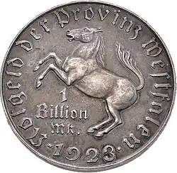 Das 1-Billion-Mark-Stück der Provinz Westfalen als Münze mit dem höchsten Nennwert aller Zeiten sowie die anderen Notmünzen der Provinz, die in den Jahren 1921, 1922 und 1923 geprägt wurden, zeigen auf der Wertseite das von Rudolf Bosselt, dem Direktor der Kunstgewerbeschule Magdeburg, entworfene Westfalenross der Provinz aus der Zeit der Weimarer Republik. (Siehe dazu auch Notmünzen mit dem Brustbild von Annette v. Droste-Hülshoff)