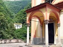 Die Rokokostuckaturen stammen von Visetti aus Valsolda. Es schliesst sich ein dreigeschossiges Pfründnergebäude an. In der offenen Kalvarienkapelle aus dem Jahr 1767 befindet sich eine Kreuzigungsgruppe von Domenico Gelosa, hinter der sich früher ein Fresko Jerusalems befand.[2][3]