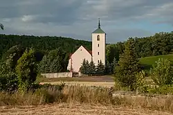 - Pfarrkirche Mariä Geburt (polnisch Kościół p.w. Narodzenia NMP), erbaut 13.–14. Jahrhundert, 1899 erneuert, umgeben von einer Umfassungsmauer.[4] Daneben ein Friedhof und ein Pfarrhaus, erbaut 18. Jahrhundert.