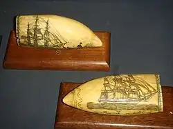 Draußen vor dem Haus ist ein Walfangboot zu sehen, das mit Rudern verschiedener Länge ausgerüstet ist. Die besondere Form der Ruder-Dollen ermöglichte ein besonders leises Rudern. Auch einige große Kessel für die Walfleischverarbeitung sind zu sehen.