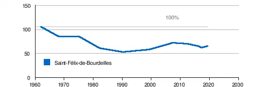 Die Bevölkerung in der Gemeinde Saint-Félix-de-Bourdeilles war von 1962 bis 1990 rückläufig. Sie hatte aber danach einen Aufwärtstrend zu verzeichnen.