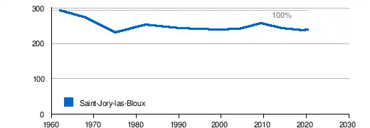 Die Bevölkerungsentwicklung in Saint-Jory-las-Bloux war von 1962 bis 1975 rückläufig, stabilisierte sich dann aber und erreichte einen neuen Höhepunkt im Jahr 2009. Seitdem ist die Tendenz wieder rückläufig.