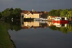 Das Schloss am rechten Ufer des Kanals wurde ursprünglich im 13. Jahrhundert errichtet. Von der ursprünglichen Funktion als Burg sind nur ein Turm über einem Eingang, Spuren einer Zugbrücke und eine Schießscharte in der Nähe des Turms übrig geblieben.