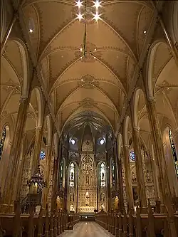 Das neugotische Kirchengebäude besteht aus grauem Kalkstein. Es ist 71 Meter lang und 32 Meter breit, der Kirchturm erreicht eine Höhe von 69 Metern. Der Innenraum, ein Werk von Victor Bourgeau, ist reich mit Motiven verziert, die die französische Fleur-de-lys mit dem irischen Shamrock kombinieren. Jede der 25 Meter hohen Säulen ist aus dem Stamm einer weißen Kiefer geschnitzt und mit Marmor verkleidet. Die drei Altäre wurden im Jahr 1861 eingefügt. Zu den weiteren Verzierungen gehören vier Fensterrosen und 150 Ölgemälde mit Abbildungen von Heiligen.[3]