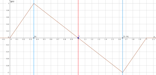 Gemäß der Theorie der Fourier-Reihen lassen sich die Amplituden mit einem Integral bestimmen. Damit ist das Anfangswert-Problem komplett beschrieben. Zur idealisierten Beschreibung der gezupften Saite ist die Funktion eine Dreiecks-Funktion. Diese ist in der Abbildung „Anfangswertproblem der gezupften Saite g(x)“ dargestellt. Formal stellt sich wie folgt dar.