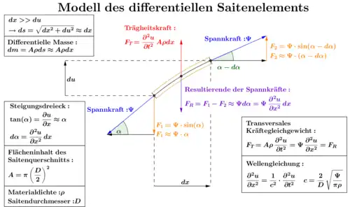 Zur Erinnerung: ist die Frequenz der Grundschwingung, ist ihre Schwingungsdauer, die Länge der Saite, ihr Durchmesser, ihre Dichte, also Masse pro Volumen, und die Spannkraft der Saite. Die Frequenzen der Oberschwingungen sind ganzzahlige Vielfache der Frequenz der Grundschwingung.