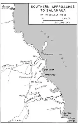 Als Teil der Annäherung an Salamaua sollte der Hauptteil des amerikanischen 162. Infanterieregiments, das aus dem 1. Bataillon unter Oberstleutnant Harold Taylor und dem 3. Bataillon unter Archibald Roosevelt bestand, einen flankierenden Vorstoß entlang der Küste nördlich der Nassaubucht in Richtung Logui unternehmen. Die US-Truppen überquerten den Fluss Bitoi und rückten entlang der schmalen Landenge östlich des Sees Salus nach Norden in Richtung Tambubucht vor. Kurz vorher war ein Streit darüber entstanden, ob die US-Truppen unter australischem Kommando standen oder nicht.