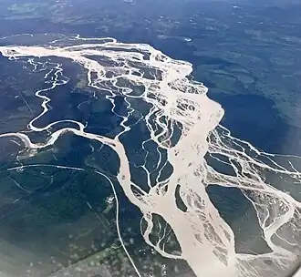 ![]() Blick flussaufwärts auf den Tanana River; links im Bild die Mündung des Salcha River | ||