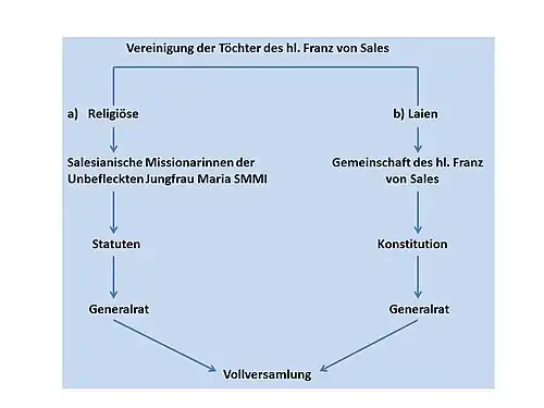 Am 25. März 1994 kam es zu einer Neustrukturierung: Der Laienzweig, die „Gemeinschaft des hl. Franz von Sales“ wurde nach kirchlichem Recht in eine private „Vereinigung von Gläubigen internationalen Charakters“ umgewandelt und vom Päpstlichen Rat für die Laien offiziell als Geistliche Gemeinschaft von Laien anerkannt. Die Religiosen, also die Ordensschwestern „Missions-Salesianerinnen von der Unbefleckten Empfängnis Mariens“ (SMMI), blieben der Kongregation für die Institute geweihten Lebens und für die Gesellschaften apostolischen Lebens unterstellt. Beide eigenständigen Zweige firmieren unter dem Namen „Vereinigung der Töchter des hl. Franz von Sales“, jede Organisation verfügt über einen Generalrat, die beiden Räte treten zur Vollversammlung zusammen.
