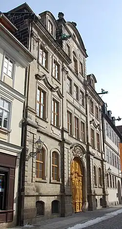 Bedeckt ist das Gebäude mit einem mit Schiefer gedeckten Mansarddach. Die mit Werkstein gestaltete Fassade ist mit monumentalen Pilastern versehen. Sie gliedert sich in drei mittige und je zwei seitliche Fensterachsen. Der Mittelteil ist risalitartig gestaltet. Mittig im Gebäude ist das als Rundbogen erstellte Portal. Oberhalb des mit beschnitzten Türblättern versehenen Portals befindet sich eine Wappenkartusche. Innerhalb der Durchfahrt besteht eine mit Stuck versehene Felderdecke. Das Gebäude ruht auf einem hohen Quadersockel. Die seitlichen Fenster des ersten Obergeschosses sind von im chinesischen Stil geschwungenen Giebeln überspannt. Das Zwerchhaus wird von einem Segmentgiebel bekrönt. Zur Hofseite hin ist das Haus schlichter gehalten. Auch das hier befindliche große Zwerchhaus verfügt über einen Segmentgiebel und ist darüber hinaus mit einer Ladeluke versehen. Am Haus befindliche Wasserspeier sind als Drachenköpfe gestaltet.