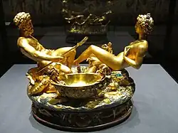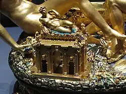 Die Saliera gilt als die einzige erhaltene Goldschmiedearbeit Benvenuto Cellinis (1500–1572).[1] Sie ist ein Werk der Spätrenaissance und zeigt eine allegorische Darstellung, in deren Zentrum zwei antike Göttergestalten stehen: Auf der einen Seite lagert Neptun, der Gott des Meeres, mit einem Dreizack bewaffnet. In der Form eines Schiffes öffnet sich zu seiner Rechten ein Salzbehälter. Dieses wird von vier pferdeartigen Wesen mit Rossleib und Fischschwänzen getragen. Ihm gegenüber sitzt Tellus, die römische Göttin der Erde. An ihrer Seite befindet sich ein Tempelgebäude, das als Behälter für Pfeffer dient. Weiter sind Landtiere zu erkennen und ein von Blüten und Früchten strotzendes Füllhorn.