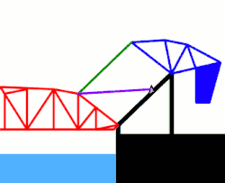GegengewichtsrahmenDas Heben und Senken des Trägers erfolgt bei diesem von Joseph Baermann Strauss entworfenen Klappbrückentyp über Zugstangen (Zahnstangen), die das ausbalancierte System aus Fachwerkträger und Gegengewichtsrahmen bewegen. Beide Teile haben ihren eigenen Drehpunkt an den jeweiligen ruhenden Drehzapfen und sind über bewegliche Streben miteinander verbunden. Bei der Salmon Bay Bridge liegt der Drehpunkt des Brückenträgers in Höhe der Gleisebene (etwa 20 m über Niedrigwasser) und der Drehpunkt des Gegengewichtsrahmen 16 m höher. Zur Kompensation des Gewichtes des Trägers ist am Gegengewichtsrahmen ein Betongewicht angebracht. Durch eine sorgfältige Abstimmung der Gewichte wird nur eine geringe Kraft an den Zugstangen benötigt, um die Konstruktion aus Stahl und Beton in Bewegung zu setzen. Der etwa 2100 Tonnen schwere Fachwerkträger lässt sich bei der Salmon Bay Bridge in 75 Sekunden bis zu einem Winkel von 83° öffnen. Das Betongewicht wiegt etwa 1500 Tonnen,[14] die restlichen 600 Tonnen entfallen auf die Stahlkonstruktion des Gegengewichtsrahmens.[13]