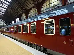 Das Königshaus von Dänemark hat einen eigenen Salonwagen, der 1979 gebaut wurde.[124] In der Praxis wird das Fahrzeug heute nur noch selten eingesetzt. Zum dänischen Hofzeremoniell gehört es, dass verstorbene Monarchen mit einem Sonderzug von Kopenhagen nach Roskilde überführt werden, wo sie im dortigen Dom traditionell ihre letzte Ruhestätte finden. In diesen Zügen wird auch immer der aktuell eingesetzte königliche Salonwagen für die Königsfamilie mitgeführt.[125] Mehrere ehemalige dänische königliche Salonwagen sind im Dänischen Eisenbahnmuseum in Odense ausgestellt: