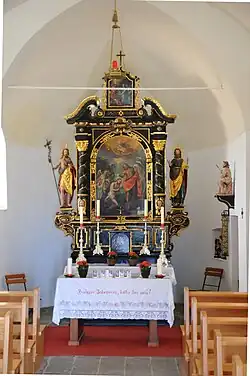 Der Innenraum ist mit einer leichten Spitztonne mit Stichkappen überwölbt, der Chorbogen ist ebenfalls spitz. Der geschnitzte Hochaltar von 1666 trägt ein Bild der Taufe Jesu und die Statuen des hl. Johannes des Täufers und des hl. Bartholomäus.
