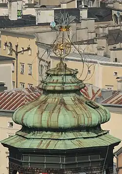 Über den Turmarkaden und seinem mit Kupfer gedeckten niedrigen Barock-Zwiebelturm ließ Erzbischof Johann Ernst Graf Thun ein vergoldetes astronomisches Gerät, eine „sphaera armillaris“ anbringen, die den Lauf der Planeten beschreiben kann, jedoch keine sehr genauen astronomischen Beobachtungen von Sonne und Planeten erlaubt. Die Erfindung wird Archimedes zugeschrieben, das Gerät diente zuerst als didaktisches Instrument, später auch als Messinstrument zur Lagebestimmung von Himmelskörpern. Dieses Gerät, früher auch eine (von Gott gelenkte) „Weltmaschine“ genannt, ist samt umgebendem Schmuckwerk etwa vier Meter hoch.