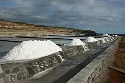 Geerntet wird zunächst die feine, weiße sogenannte „Salzblume“ (Fleur de Sel), die sich im letzten Becken als dünner Film auf der Oberfläche des verbleibenden Wasser-Salz-Gemisches bildet. Die größeren Kristalle fallen hingegen weiter nach unten. Dieses grobe Salz wird ein bis zwei Tage später geerntet. Als dritte Salzform wird sogenanntes Stößelsalz gewonnen.[4] Das aus den Becken entnommene Salz wird in angrenzenden Lagerräumen getrocknet.