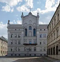 Das barocke Gebäude liegt an der Ostseite des Rings und wurde zwischen 1669 und 1679 verbaut. Architekt war P. Schüller aus Olmütz. Das dreigeschossige Gebäude besitzt einen Grundriss in Form eines lateinischen E. Die Ausgestaltungen der Aula und des Bibliotheksaals stammen etwa von 1680.