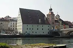 - ↑ Baudenkmäler Regensburg. (pdf) Bayerisches Landesamt für Denkmalpflege, S. 143, abgerufen am 8. August 2014: „Ehem. städtischer Salzstadel, dreigeschossiges und traufständiges Lagerhaus mit abgewalmtem Satteldach zu fünf Speichergeschossen, über unregelmäßigem Grundriss, Erdgeschoss durch Sandsteinpfeiler in drei Schiffe unterteilt, darüber mächtige Holzkonstruktionen, 1616-20; zusammen mit Brückentorturm, 14. Jh.; siehe unter Brückstraße 2.“