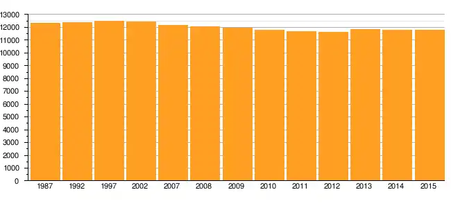 | Einwohner | 12.300 | 12.395 | 12.462 | 12.432 | 12.141 | 12.074 | 11.952 | 11.808 | 11.647 | 11.605 | 11.819 | 11.800 | 11.807 |