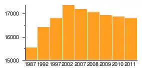 | Einwohner | 15.539 | 16.416 | 16.803 | 17.360 | 17.197 | 17.067 | 16.936 | 16.868 | 16.811 |