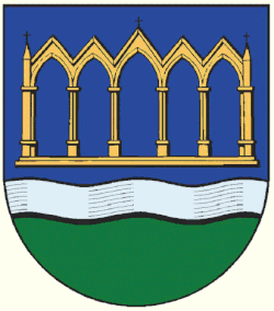 Blasonierung: „Von Blau und Grün durch eine erniedrigte (gesenkte) silberne Wellenleiste geteilt; oben eine fünftürige goldene Pforte.“
