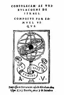 - Consolacam as tribulacoens de Israel. Composto par Samuel Usque Ferrara 1553 (zweite Auflage Amsterdam 1559).