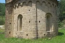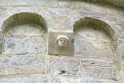 Die Außenwand der Apsis gliedern Blendarkaden und Lisenen in drei Mauerabschnitte, die von je einem schmalen, rundbogigen Fenster durchbrochen sind. Die Blendbögen stützen sich auf Kragsteine, die mit Rosetten skulptiert sind. Auf einem Kragstein ist ein Kopf dargestellt, auf einem anderen ein gleichschenkliges Kreuz, das eine Hand umfasst.