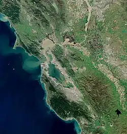 Die Bucht von San Francisco (San Francisco Bay) ist namensgebend für die sie umgebende Region. An die eigentliche Bucht angeschlossen sind zwei Nebenbuchten, die San Pablo Bay und die Suisun Bay. Die Countys der Bay Area gruppieren sich um diese drei Buchten, die insgesamt eine Wasserfläche von 1600 km² umfassen.[2] Die San Francisco Bay und ihre Nebenbuchten werden nach Norden und Süden durch die pazifischen Küstengebirge begrenzt, nach Westen durch den Pazifischen Ozean und nach Osten durch das Kalifornische Längstal (Central Valley).