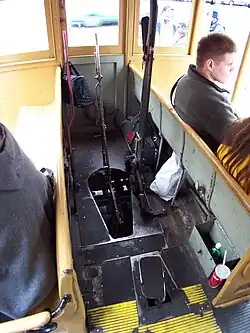 Die zweite Person ist der Conductor ‚Schaffner‘,[8] der die Klotzbremse am hinteren Drehgestell mittels einer Kurbel am Wagenende bedient und die Fahrkarten verkauft. Versagen alle normalen Fahrbremsen, steht dem Gripman noch eine Notbremse zur Verfügung. Wird diese betätigt, wird ein Stahlkeil in den Kabelschlitz der Straße gerammt, die Bremse heißt daher Slot brake, also Schlitzbremse, was den Wagen augenblicklich zum Stehen bringt. In vielen Fällen ist danach allerdings ein Schweißbrenner nötig, um den Keil aus dem Schlitz zu entfernen und das Fahrzeug wieder fahrbereit zu bekommen.