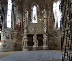 Die stützenden Pfeiler des Monumentes sind mit sechzehn Statuetten von Aposteln, Propheten und Königen dekoriert, während auf den gotischen Wimpergen und an einigen anderen Stellen die königlichen Wappen abgebildet sind.[10]
