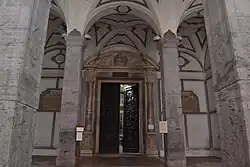 Die Empore der Kirche erreicht man von der südöstlichen Ecke des Kreuzgangs.[13] Von hier hat man einen wunderbaren Blick ins Kirchenschiff und auf die außergewöhnliche Kassettendecke. Im Südwesten des Kreuzgangs befindet sich der Zugang zum Chor (oder cappellone) in der Apsis der Kirche.[1]