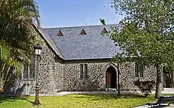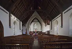 Das Gebäude, das von einer Gartenfläche umgeben ist, hat die Form eines lateinischen Kreuzes ohne Vierung. Die Mauern bestehen aus Natursteinen, die im Innenraum verputzt sind. Fenster und Türen haben Spitzbögen. Die Kirche besitzt keinen Turm und hat erst seit der Umwandlung in eine katholische Kirche ein Kreuz an der Fassade. Das Hauptschiff ist etwas breiter als der Altarraum, von dem es durch einen Spitzbogen getrennt wird. Das Gebälk des Satteldaches ist innen sichtbar. Im linken Querschiff steht eine Orgel.[2]