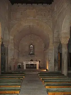 Hufeisenbögen finden sich auch im Inneren, bei den Fensteröffnungen, dem Triumphbogen und den Bogenstellungen zwischen den Seitenschiffen und dem Mittelschiff. Letztere werden von Säulen aus grauem, beigem und rosa Marmor getragen und sind Spolien aus römischer Zeit. Von den Kapitellen ist eines ebenfalls eine römische Spolie in korinthischem Stil, alle anderen sind westgotische Nachahmungen.