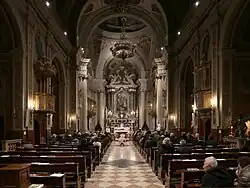 Der Innenraum ist im Geiste der Dekrete des Konzils von Trient einschiffig und wird von einem Tonnengewölbe überspannt, angefügt sind sechs Seitenkapellen. Die Kuppel auf dem zylindrischen Tambour trägt über der Laterne ein Kreuz auf einer Kugel.