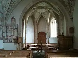 Die Bausubstanz der Mauern des Kirchenschiffs ist mittelalterlich. Das heutige spätgotische Gebäude wurde kurz vor der Reformation 1515 errichtet. Der Kirchturm mit dreigeschossiger Glockenstube schliesst im Osten an die Fassade an, zeigt romanischen Stil und trägt ein Zeltdach. Schiff und Chor werden von einem durch Rankenmalerei verzierten Sterngewölbe getragen. An den Wänden finden sich Gemälde aus der Gründungszeit, die die Verfolgung und Gefangennahme des heiligen Blasius (rätoromanisch Plasch) zeigen, unter dessen Patrozinium die Kirche ursprünglich auch stand. Die durch hochwertige Schnitzereien verschönerte Kanzel aus der Barockzeit datiert auf das Jahr 1709. Im Chor findet sich ein Bibelschrank aus der Zeit des Rokoko ca. 1760.
