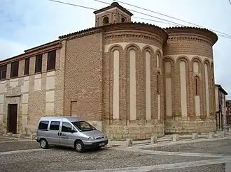 Markantester Bauteil ist die Chorpartie mit ihren drei Apsiden im Mudéjar-Stil. Auf einer Sockelzone aus exakt behauenen Natursteinblöcken erheben sich insgesamt 21 gleich hohe, schlanke und kapitelllose Arkadenbögen aus gemauerten Ziegelsteinen, die alle drei Apsiden gleichermaßen umspannen; die Felder im Innern sind verputzt – fünf davon haben schlanke Fensteröffnungen, die ursprünglich sehr wahrscheinlich unverglast waren. Oberhalb der Arkadenbögen alterniert das Ziegelsteinmauerwerk zwischen waagerecht und senkrecht verlegten Steinen; darüber befindet sich ein Zahnschnittfries sowie ein mehrfach abgestuftes und nach außen vorkragendes Mauerwerk.
