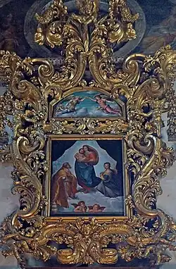 Neben der Madonna und Raffaels Engeln sind auf dem Bild Sixtus II. und Barbara von Nikomedien zu sehen, von denen seit der Zeit Kaiser Ludwigs II. Reliquien in der Kirche aufbewahrt wurden. Seit dieser Zeit wurden in der Kirche zudem Reliquien von Fabian, Timotheus, Symphorianus, Marcellus, Apuleius, Germanus, Macarius Romanus, Felix, Martina und vier der unschuldigen Kindlein von Bethlehem verehrt sowie ein Arm des Sebastian.[1]