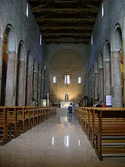 Am Ende des Kirchenschiffs zeigen sich ein früherer Zugang zur abgerissenen Krypta sowie Grabinschriften von drei in der Krypta bestatteten Bischöfen und ein Teil des Terrakottabodens eines Gebäudes aus römischer Zeit. Auf der linken Seite befindet sich ein wertvoller Ambo aus dem 12. Jahrhundert im deutsch-französischen Stil. Er zeigt die Symbole der vier Evangelisten: den geflügelten Menschen des Matthäus, den Löwen des Markus, den Adler des Johannes und den Stier des Lukas. Das marmorne Flachrelief vor dem Altar stammt aus dem 10. Jahrhundert und zeigt den thronenden Christus mit dem Erzengel Gabriel mit dem Fächer auf der linken Seite und dem Erzengel Michael, der den Teufel zertritt, auf der rechten Seite. Unter dem Altar befinden sich die Reliquien des hl. Vicinio, während die Kette im Tabernakel aufbewahrt wird.[3]