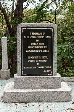 Bereits kurz nach dem Krieg errichtete die Bevölkerung Sandakans einen Gedenkstein, der den Opfern der Besatzung innerhalb Sandakans gewidmet war. Dieser Gedenkstein, der heute auf dem Platz vor dem District Office steht, wurde am 17. September 1946 durch den britischen Generalgouverneur von Malaya und Britisch-Borneo, Sir Malcom MacDonald, eingeweiht. Die chinesische Gemeinde, vertreten durch die Chinesische Handelskammer Sandakan, folgte diesem Beispiel kurze Zeit später und weihte ihrerseits ein Denkmal ein; dieses war speziell den Opfern des Massakers an der chinesischen Bevölkerung gewidmet.[4] Dieses Denkmal bestand zunächst nur aus der Stele mit der heute noch vorhandenen Inschrift.