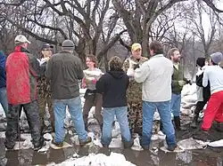Der Transport der gefüllten Säcke zur Einsatzstelle kann oft nicht vollständig durch LKW, Boote oder Hubschrauber durchgeführt werden. Gründe dafür sind durchweichte Deiche oder unpassierbare Brücken. Deswegen geschieht der Transport zur Verlegestelle in der Regel über eine Menschenkette.