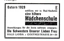 - ↑ s. hierzu Eugen Rieß Chronik – 75 Jahre St.-Lioba-Schule, S. 14–42 in: St. Lioba Jahresbericht 2003/2004 = Jubiläumsschrift zum 75-jährigen Jubiläum, s. auch M. Mathild Koppers, Chronik 1927–1953. in: St. Lioba 1929–1981. Zur Einweihung des Erweiterungsbaus und zur Nachfolge der St. Lioba-Schule 1929–1979, Bad Nauheim 1981, S. 35–55