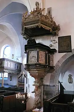 Die Kanzel stammt aus der ersten Hälfte des 17. Jahrhunderts von einem unbekannten Künstler mit der Signatur A.S. Die Reliefs der Kanzel stellen Szenen aus dem Leben Jesu dar: Verkündigung, Geburt, Abendmahl, der Tod am Kreuz und die Auferstehung. Unter den vergoldeten Engeln befindet sich ein ebenfalls vergoldetes Monogramm mit der Inschrift „CIV“, was als Huldigung an den dänischen König Christian IV. gedeutet wird. Die Kanzel wird von Moses mit vergoldetem Haupt- und Barthaar getragen.